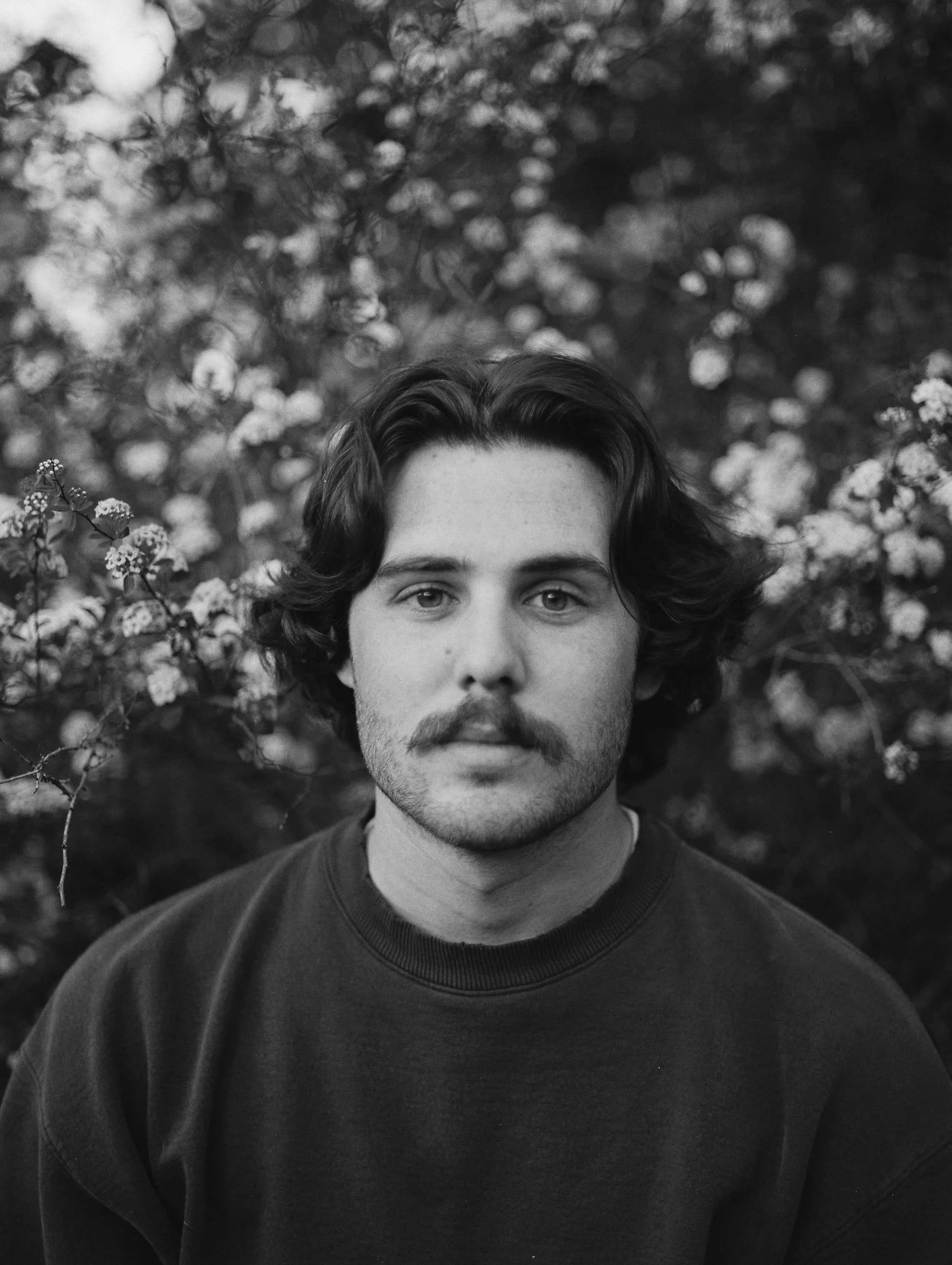Black and white photograph of a young man with wavy, medium-length hair and a mustache, standing outdoors in front of blooming flowers or shrubs.
