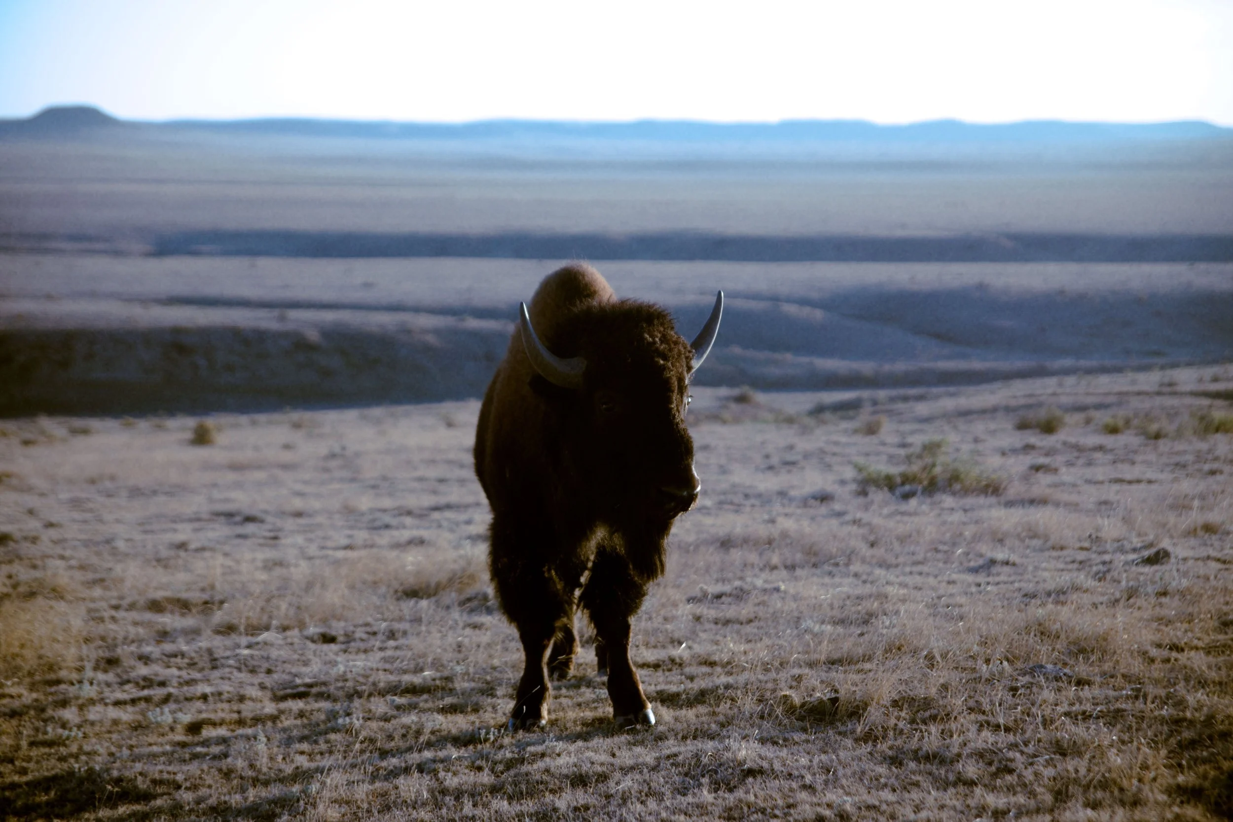 A bison standing in an open, dry landscape with distant mountains in the background.